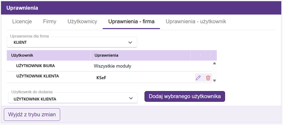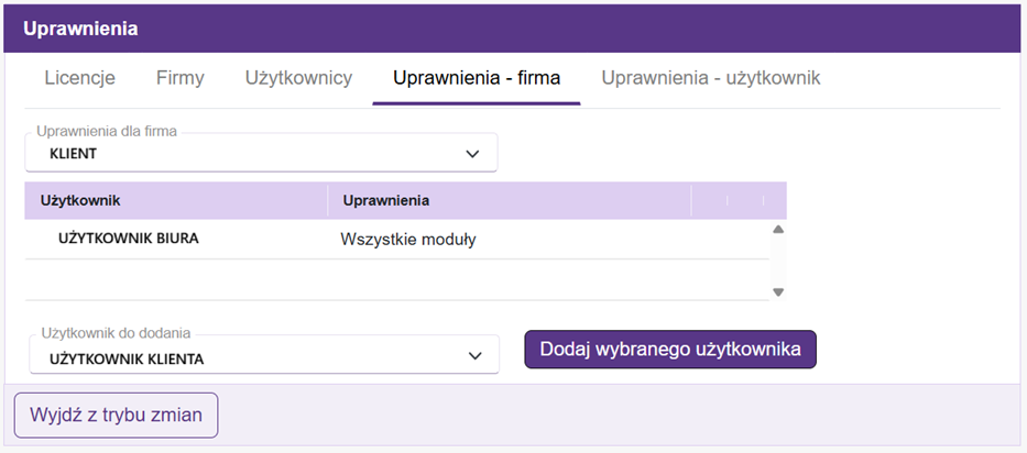 Z rozwijalnej listy 'Uprawnienia dla firma' wybierz nazwę bazy klienta.