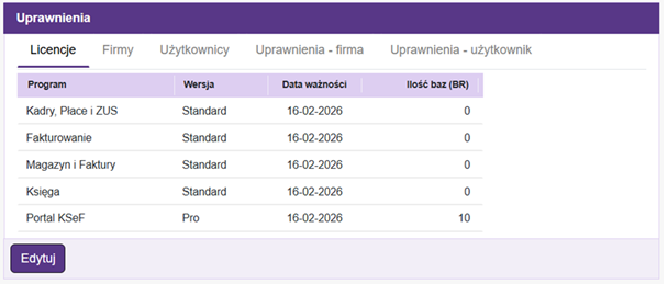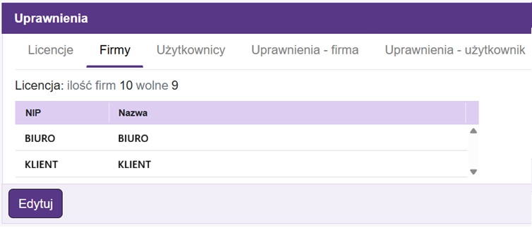 5. Zkładka Uprawnienia - użytkownik zawiera informacje do jakich baz firm ma dostęp użytkownik. Można w niej dodać uprawnienia do kolejnych baz lub usunąć.