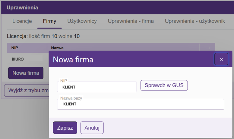 Wypełnij pole NIP, pobierz dane z GUS klikając w opcję 'Sprawdź w GUS' oraz ustal nazwę bazy. Następnie zapisz.