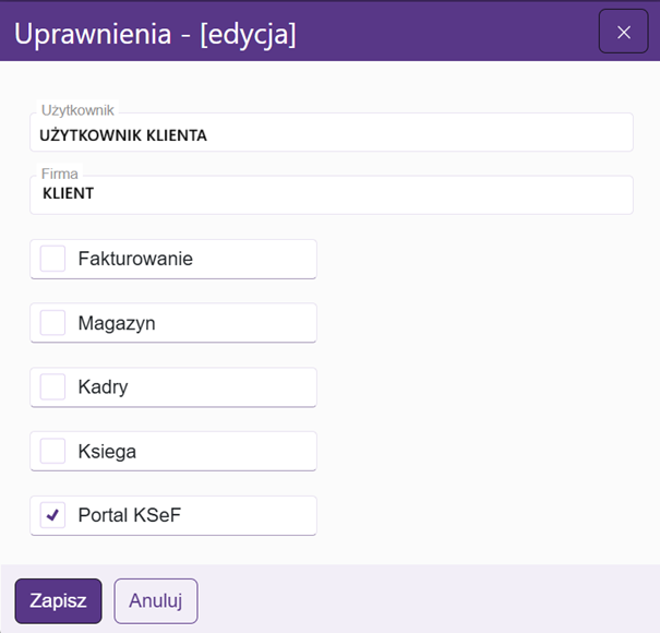 W poniższym oknie zaznacz moduły onBiznes, do których ma mieć on dostęp. Po zapisaniu danych w powyższym oknie będzie widoczna nazwa dostępnego modułu dla użytkownika klienta.