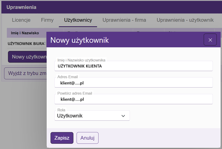 Wprowadź imię i nazwisko, adres e-mail oraz wybierz z listy rolę 'Użytkownik'.